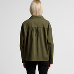 Construction: Three pocket, collared shirt jacket, unlined, gathered back at yoke, corozo buttons to close